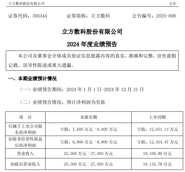 业绩预告显示,立方数科预计2024年营业收入为2.5亿元至2.7亿元,归母净利润为亏损7600万元至9600万元,与去年同期相比,亏损有所缩窄。立方数科方面表示,主要得益于公司整体战略规划的进一步调整,数字化整体解决方案业务、终端硬件业务领域拓展,基础业务的稳步提升。